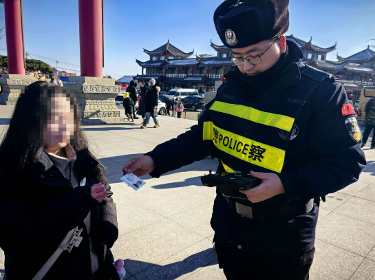 1月1日12时许,大孤山景区内游人如织,秩序井然。东港市公安局巡特警大队执勤警力在巡逻时,于景区道路旁拾获一张游客遗失的身份证。考虑到身份证对游客出行至关重要,执勤人员立即启动便民服务应急机制,迅速利用执勤无人机升空,通过高空喊话系统,在景区各主要区域循环播报寻人启事。