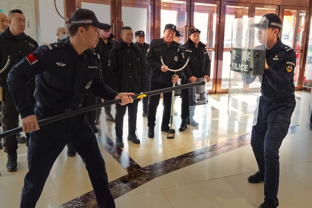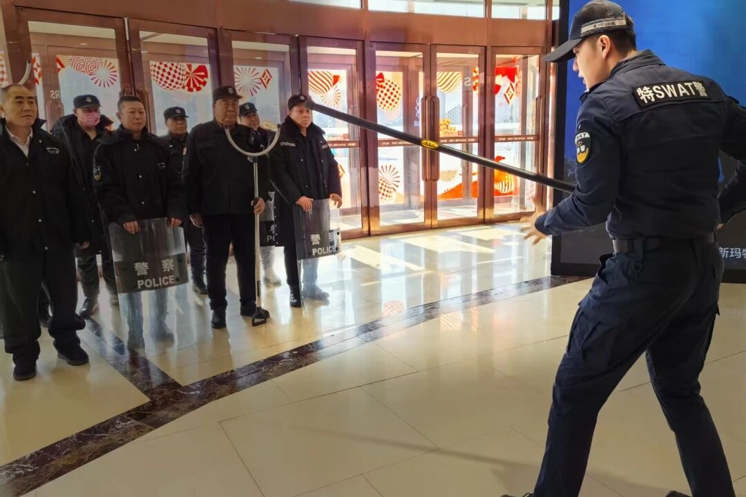 培训中,教官首先系统讲解了警用器械的使用技巧,包括盾牌的防护格挡、橡胶棍的发力控制以及约束叉的控敌要点,并重点强调了“盾在前、棍护侧、叉控身”的基础协同战术。随后分组开展实操训练,安保人员手持装备模拟“应对持械人员冲击”场景,教官一对一纠正持盾姿势偏差、棍击力度控制等问题,确保每位参训人员都能熟练掌握“防御—反击—控制”的全流程动作。